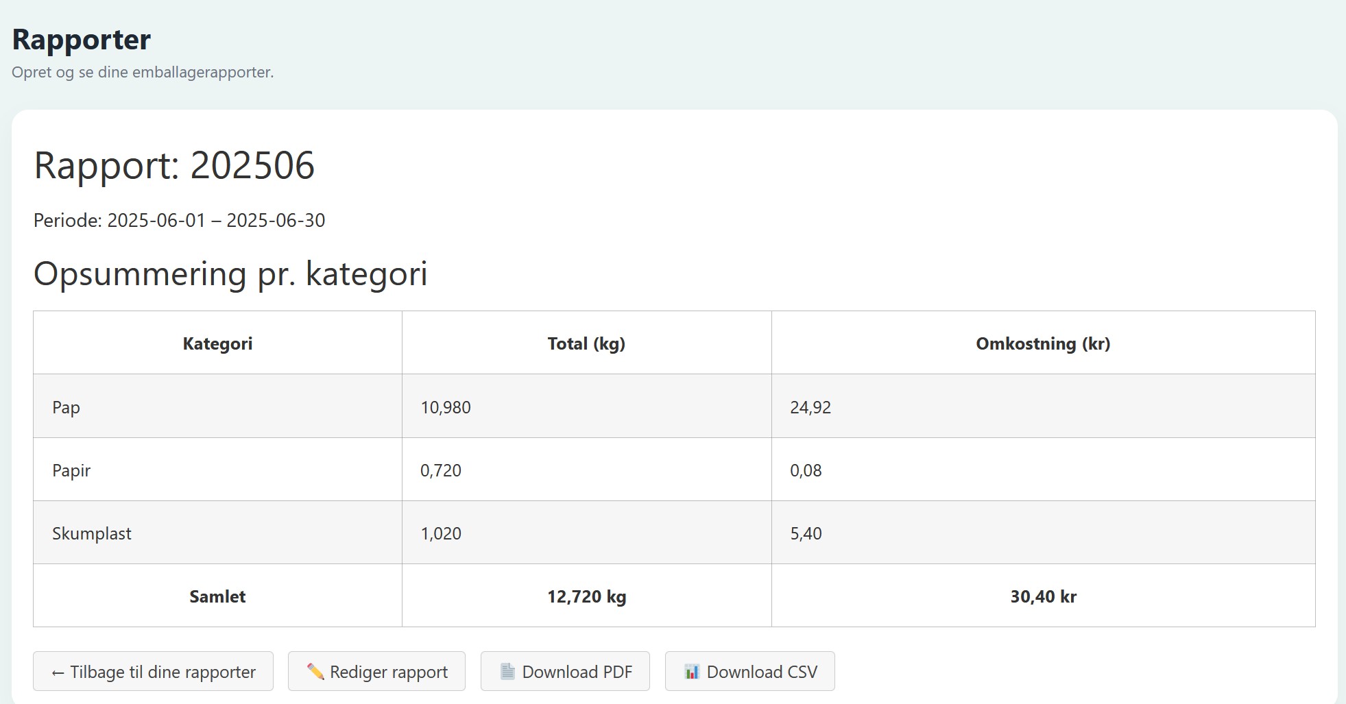 Herefter udtrækker du antal solgte enheder fra dit økonomisystem og indtaster mængden i beregneren. Systemet danner øjeblikkeligt en indberetningsklar rapport med den samlede sum af de forskellige emballagekategorier som hutigt kan tastes ind hos din kollektive ordning.