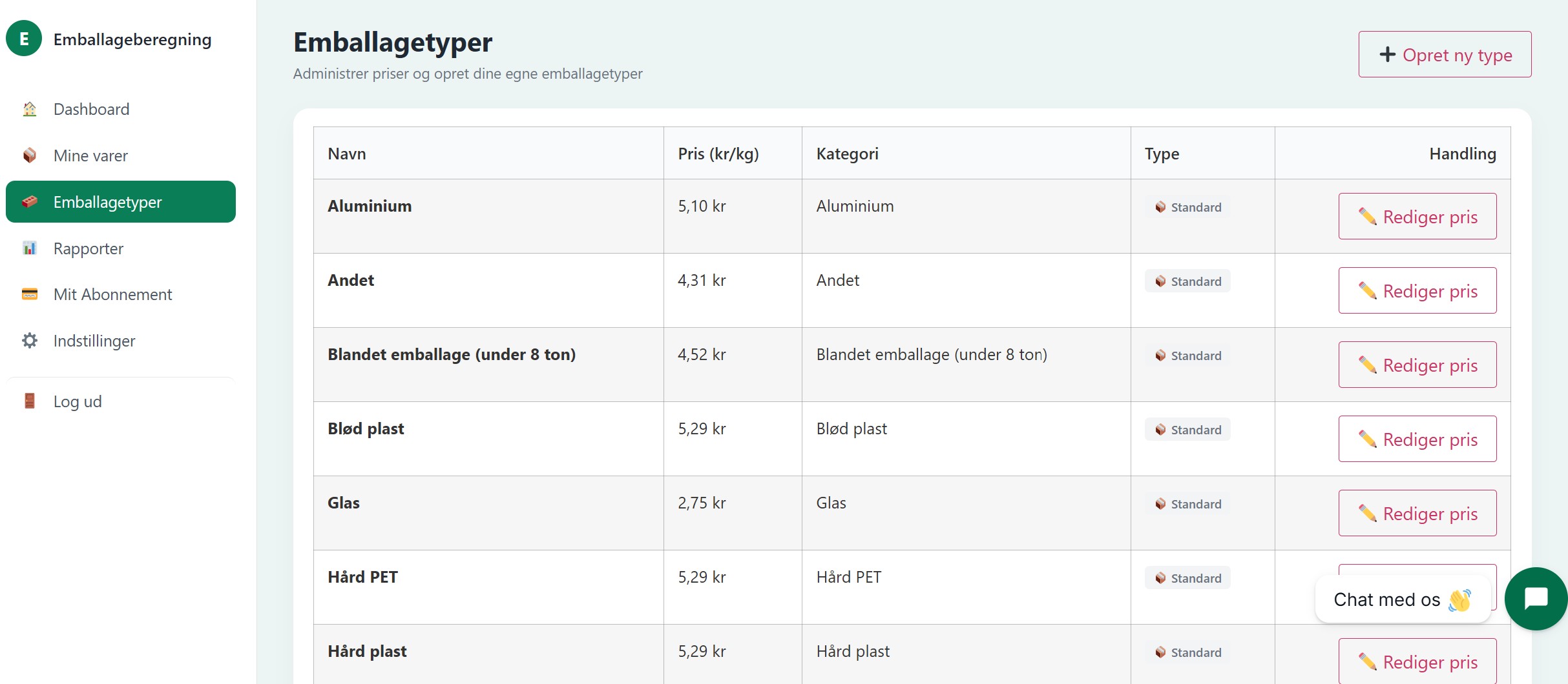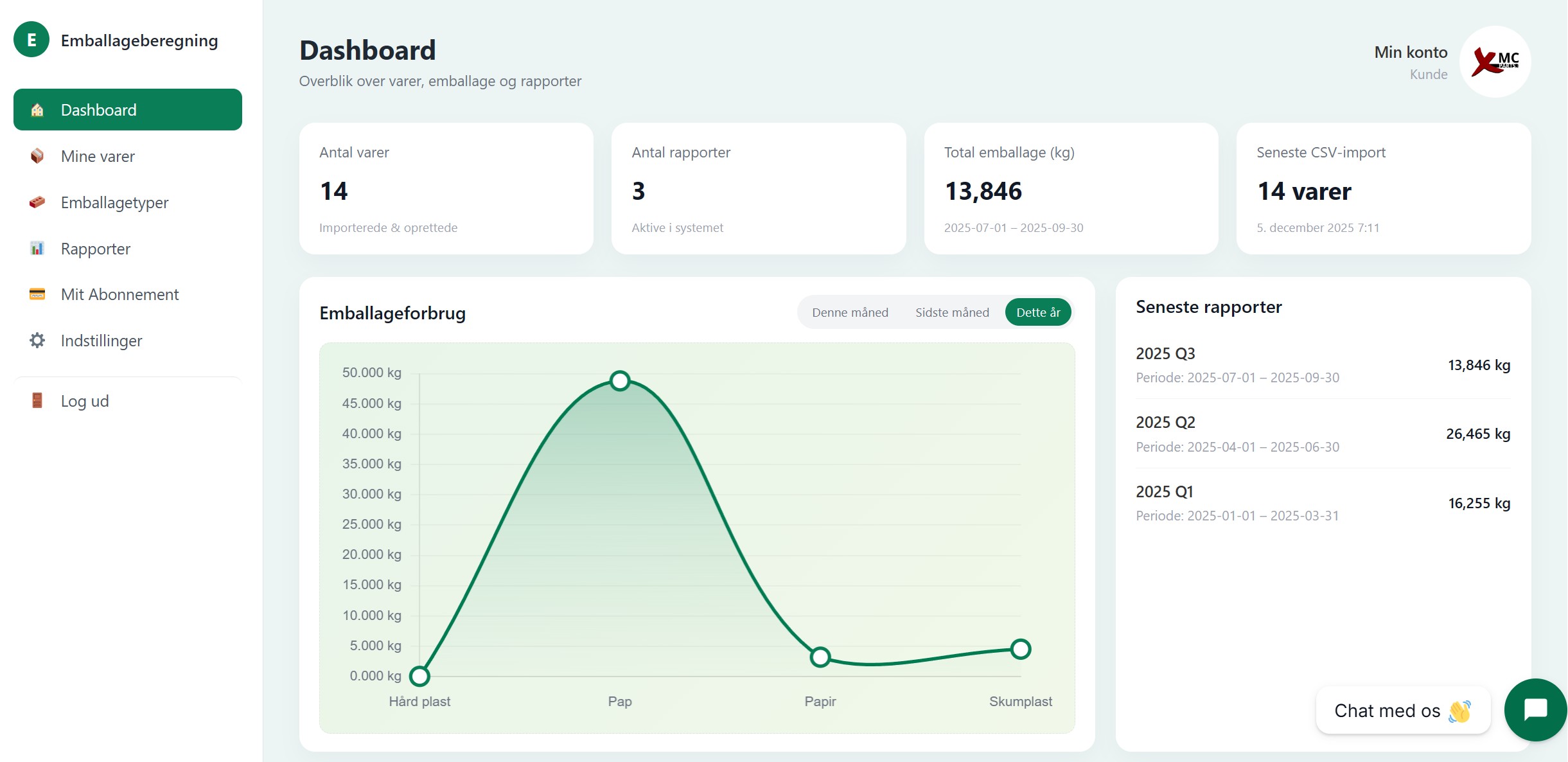 Emballageberegneren er den digitale kugleramme der er nem at bruge, giver overblik og gør det lovpligtige producentansvar for emballage enkelt og overskueligt. Få det fulde overblik og spar administration ved at erstatte usikre regneark med en struktureret, automatiseret løsning.