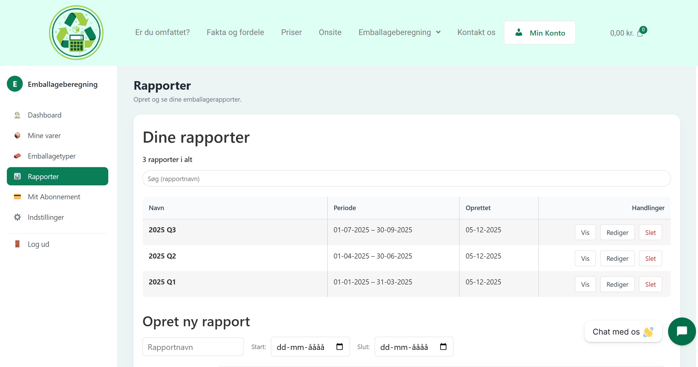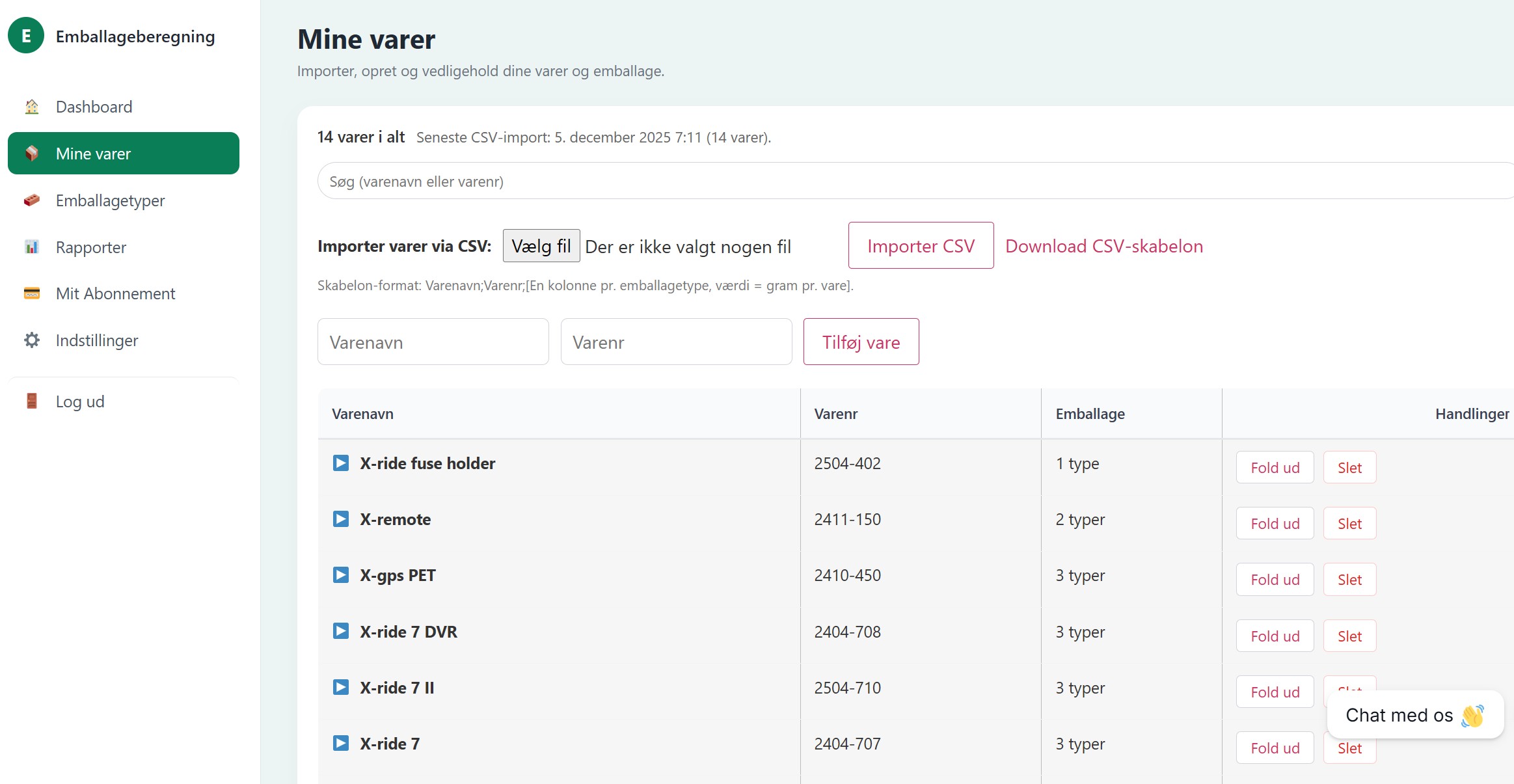 Efter et initialt forarbejde med at veje og kategorisere emballagen pr. produkt, skal du blot oprette et spejl af dine varer i emballage beregneren. Det klares nemt med at udtrække et regneark med dine produkter fra dit økonomisystem og kopiere over i CSV skabelonen som du downloader fra dit dashboard. Indtast vægten i gram i kolonerne i CSV skabelonen, gem og upload i emballage beregneren. Du finder naturligvis også udførlig guide her.